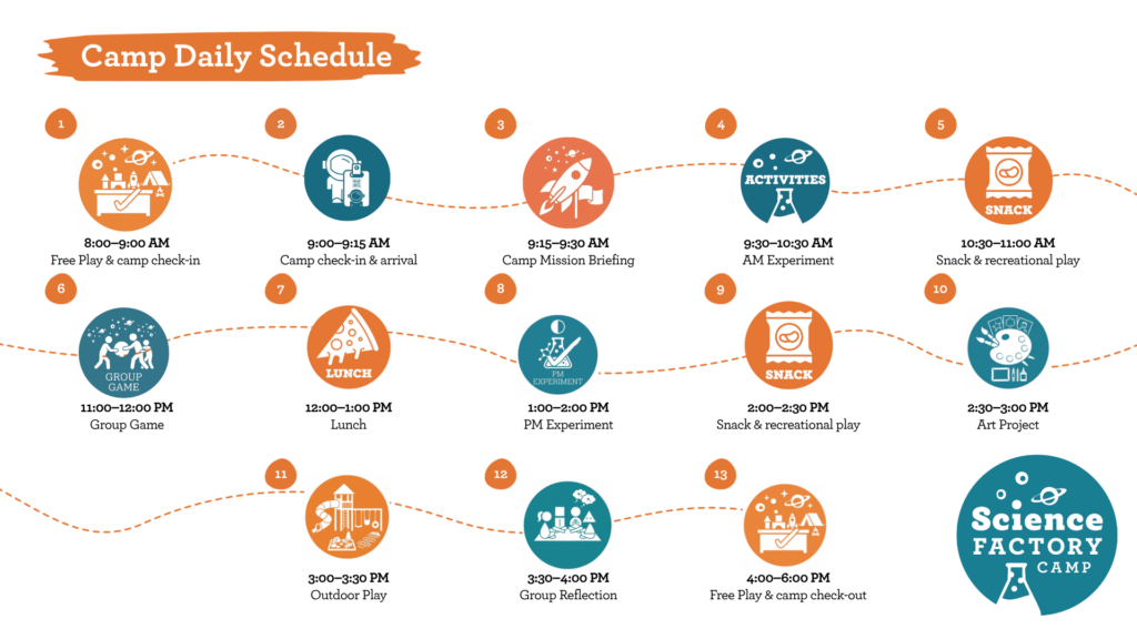 At Science Factory Camp, each day follows a thoughtful rhythm that blends experimentation, creativity, movement, and free play. Our schedule is intentionally designed to spark curiosity, encourage collaboration, and create space for both focused learning and joyful exploration.