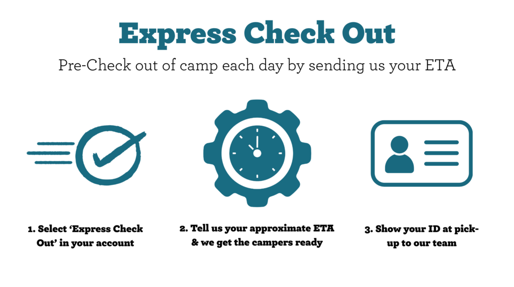 - If you completed Express Check Out prior to your arrival, your camper(s) should be waiting for you or on their way to the check-out area. Otherwise, let our staff know who you’re here to pick-up, and we’ll contact the relevant counselor to send your camper(s) over.