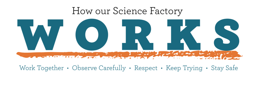 At Science Factory Camp, we use a simple set of shared values to guide how campers treat one another, approach challenges, and move through the day. We call this How Our Factory WORKS.